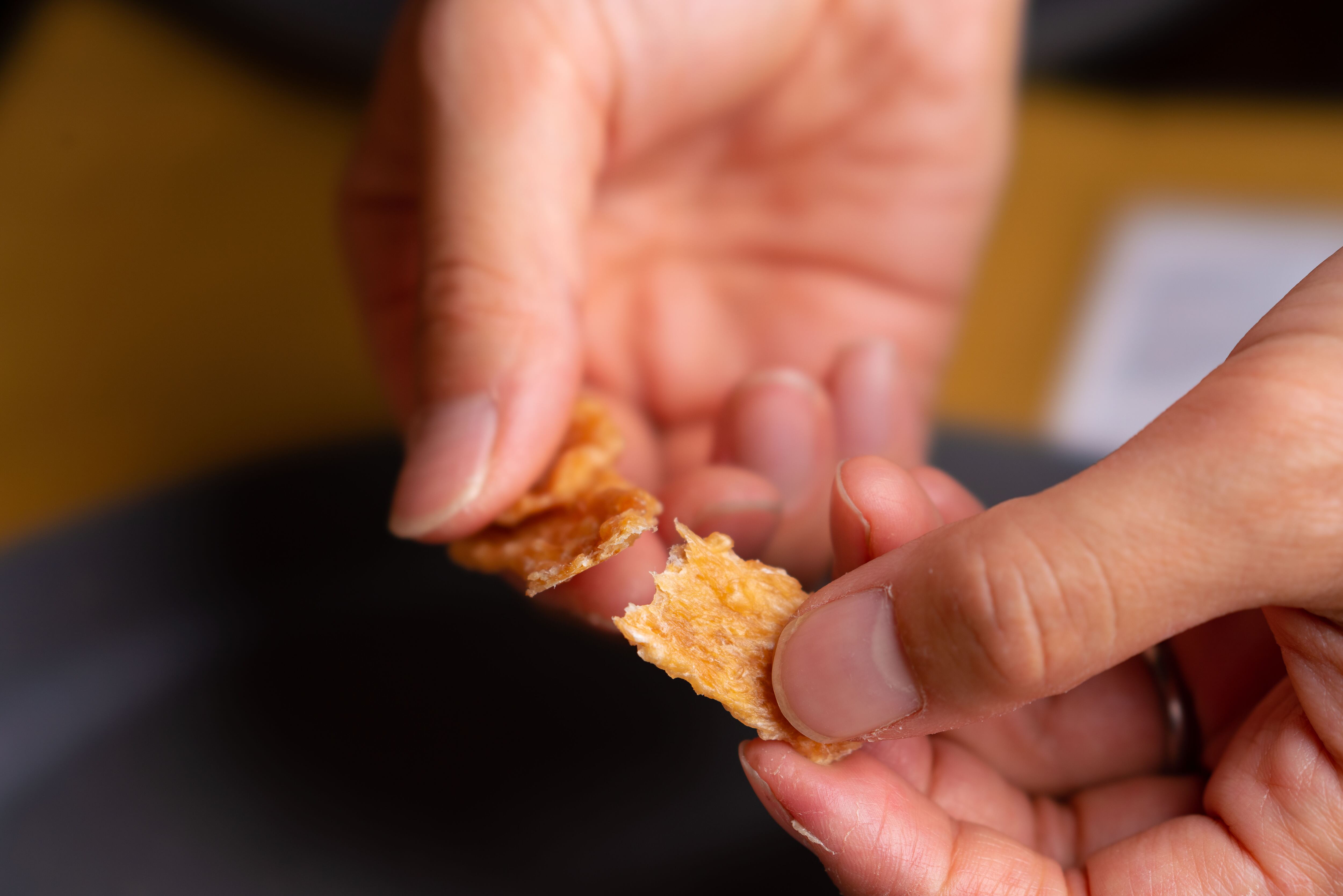 スティックは、通常のチップに比べ固めにお作りしておりますので、多少の噛み応えが欲しいわんちゃんに最適です。また簡単に手で割ることができるので、フードにふりかけ等、少量のご褒美としてお使いいただけます。